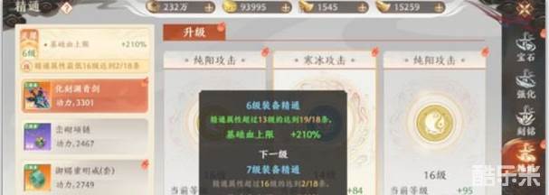 每个装备都有着一条独特的精通属性,提升精通的等级可以使增加的属性数值更高,不过这个过程需要消耗指定的材料,而且本身在升级过程中会有一定运气因素影响,运气好的话可以获得升级暴击乃至升级圆满,前者可以给予四倍经验,后者则直接将你的精通等级拉满。