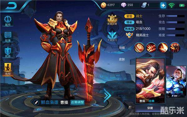曹操是一名灵活性非常高的战士英雄,同时二技能的减速以及一技能的三段位移更是能够帮助曹操很好的追击敌方英雄,大招的吸血赋予了曹操近乎不死的能力,使其成为当之无愧的上单霸主之一。