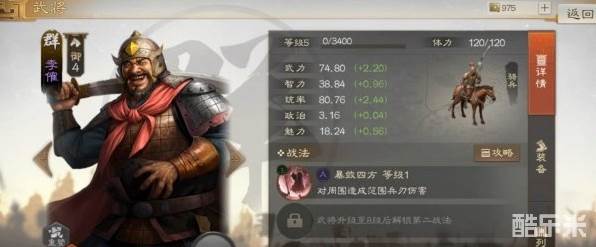 李傕从基础面板来看的话不难看出是一个不善于内政的武将,政治数值低,但是无和统率数值还算可以,因此用来前期过度一下还是很不错的,毕竟是一个盾兵兵种的输出武将。