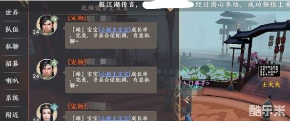 然后还有一些游戏特有的频道,最典型的就是宠物,在这个频道里虽然玩家没办法自由发言,但却可以通过一些快捷的消息传达出为自己宠物寻觅配偶的愿望,这也是游戏中比较重要的一个板块,毕竟宠物的变异就是通过它来进行的。