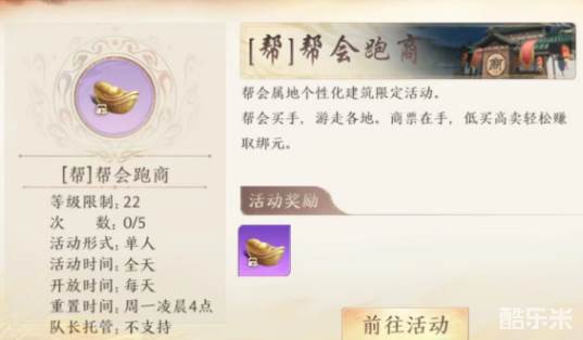 首先要了解的是,跑商并不像其他任务,大家直接领取就能去做,而是需要先向帮派管理者提出申请。而且要所在帮派建立好相应建筑物之后才会开放该项活动,如果想要长期从事跑商,在帮派选择时候就要重点关注那些等级高,活跃度高的帮派,这样才有更大发挥空间。申请到商人身份之后,每周能够完成5次任务,所以新手玩家也不用着急,即使跑商慢些也不会耽误奖励。但因为帮派同时任命商人数量有上限,所以依然要尽快将5次任务做完,给其他人留出空间。