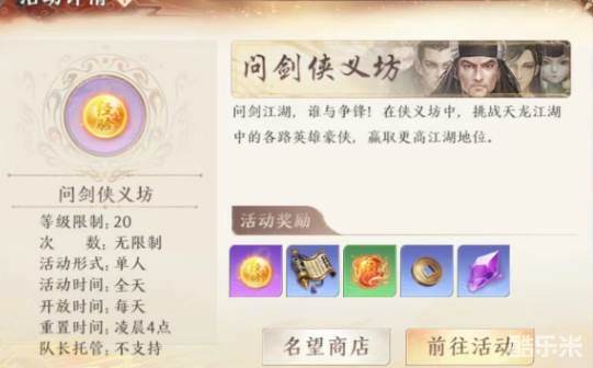当玩家等级达到20级时,就可以直接开启这项活动,而且该活动并不是单独玩法,而是属于问剑江湖里的重要组成部分,另外一部分则是江湖宗师殿。问剑侠义坊主要战斗目标是天龙八部里所出现的各种英雄人物,无论正派还是反派,都能在这里挑战到。玩家将会根据自身战力水平去不断往前挑战,类似于爬塔玩法,挑战对方实力越强,最终获取奖励也就越丰厚。
