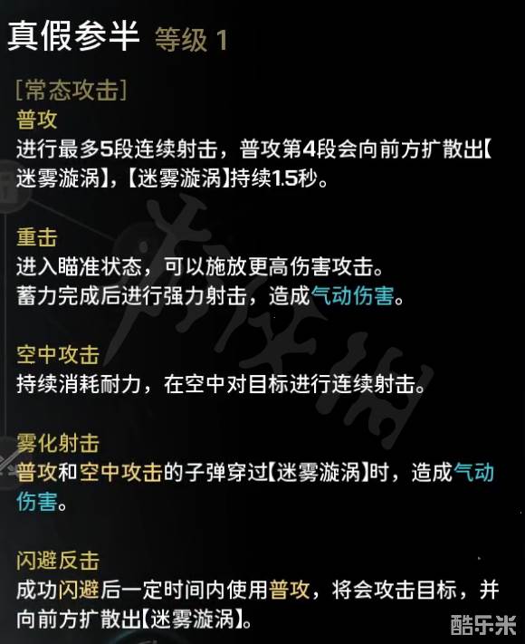 普攻:进行最多5段连续射击,普攻第4段会向前方扩散出(迷雾漩涡],[迷雾漩涡]持续1.5秒。