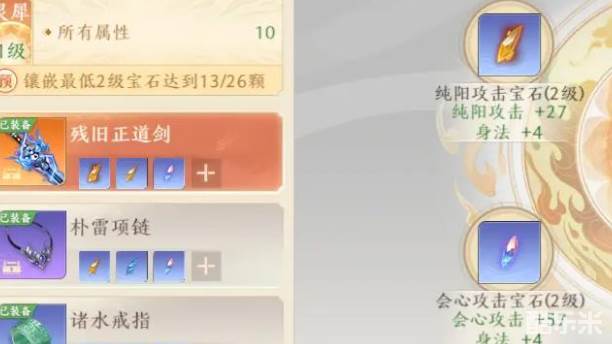 第二种方法就是通过宝石和强化来提升战力,每一件装备都能够携带四个宝石,不同类型的宝石能够带来不同的属性加成,对功力的提升也有非常大的帮助,而强化则能让装备的属性更上一层楼,效果非常优秀,在强化达到一定的等级之后还有额外的属性点加成,对功力的提升还是比较大的。