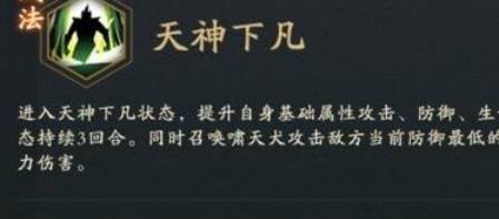 杨戬的战法名为天神下凡,使用之后能够大幅度提高自己的各项属性,包括攻击力、防御力和生命值,这个状态能够持续三个回合,同时开启天神下凡状态之后,杨戬还能够召唤出爱犬哮天犬攻击敌方防御力最低的敌人,如果这个战法升到了2级,不仅能给这个敌人造成大量伤害,还能够降低被攻击者50点气势,是一个限制敌方主C的绝佳技能。
