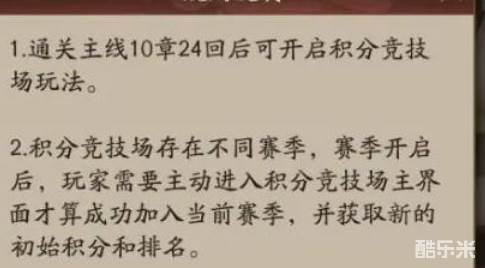 积分竞技场的开启条件就比较复杂了,需要小伙伴们通关主线10-24之后才能够开启这个竞技场,这个玩法相对来说难度更大,并且存在不同的赛季制度,在赛季开启之后小伙伴们需要主动加入竞技场的主界面,才能够成功报名,然后根据上赛季的段位或者实力获得新的初始积分和排名,想要在积分竞技场中获得更高的名次,就需要小伙伴们获得更多的积分,积分的获取方法也比较简单,挑战成功或者是防守成功就能够获得一定量的积分,如果挑战失败或者防守失败就会扣除一定的积分,如果双方之间的积分差距过大,那么相应的加减分也会更多,不过积分竞技场中能够兑换的奖励也是很多的,通过挑战成功获得的奖励能够兑换不少材料和稀有的伙伴,最重要的就是法象材料,除了在竞技场中获取,其他地方是很难获取的,因此小伙伴们需要多多挑战获得更多的积分才可以哦!