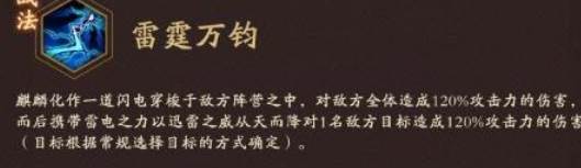 麒麟的属性为雷,战法技能为“雷霆万钧”,使用这个技能后,麒麟就会舍去肉身,化身为一道银色的雷霆,对敌方阵营的所有角色造成普通攻击倍率1.2倍的群体伤害,升到满级的话更是有着恐怖的1.8倍倍率加成哦,一般战法技能一放,敌方的杂兵就会被清理的干干净净了。