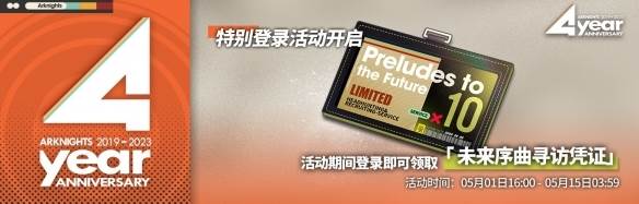 活动说明:玩家在活动期间进行登录即可在活动页面中领取登录奖励:[未来序曲寻访凭证]*1