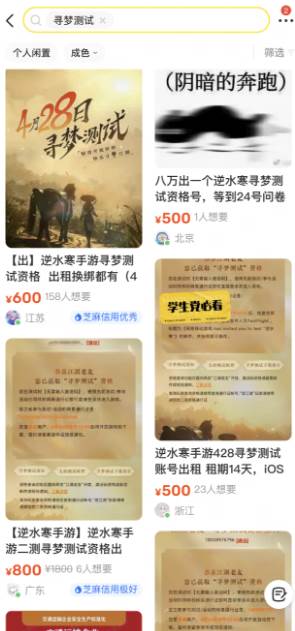 以上内容都是官方宣传时画的“大饼”,确实唬到了不少人,官网预约量已经接近3000万了!当然,还得实际上手玩一玩才能知道真假。这不,本周五(4月28日),《逆水寒》手游将开启二测【寻梦测试】,算是这些“大饼”第一次和玩家见面。测试的热度确实不低,闲鱼真实买卖激活码有上百人,价格最低500元起。