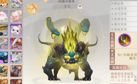 饕餮是拥有非常强势生命回复的宠物,自带技能效果在对敌方造成基础伤害后,有几率恢复自身血量。虽然也有一些输出,但是自身凭借极高的毅力,资质始终属于强化生存和辅助的地位,在其他技能选择方面也是如此。那么在选择的时候,丐帮、无尘这样比较肉的门派肯定不会带饕餮,最适合逍遥、武当这样远程输出门派,有饕餮在前边当做肉盾,后面输出会更加顺利。