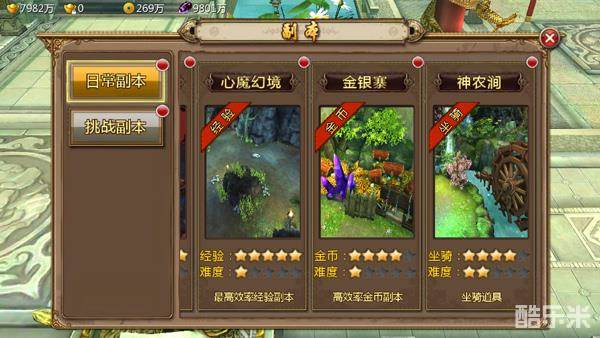 日常副本:是玩家获得经验,金币,道具的主要途径,可单人挑战也可组队挑战。