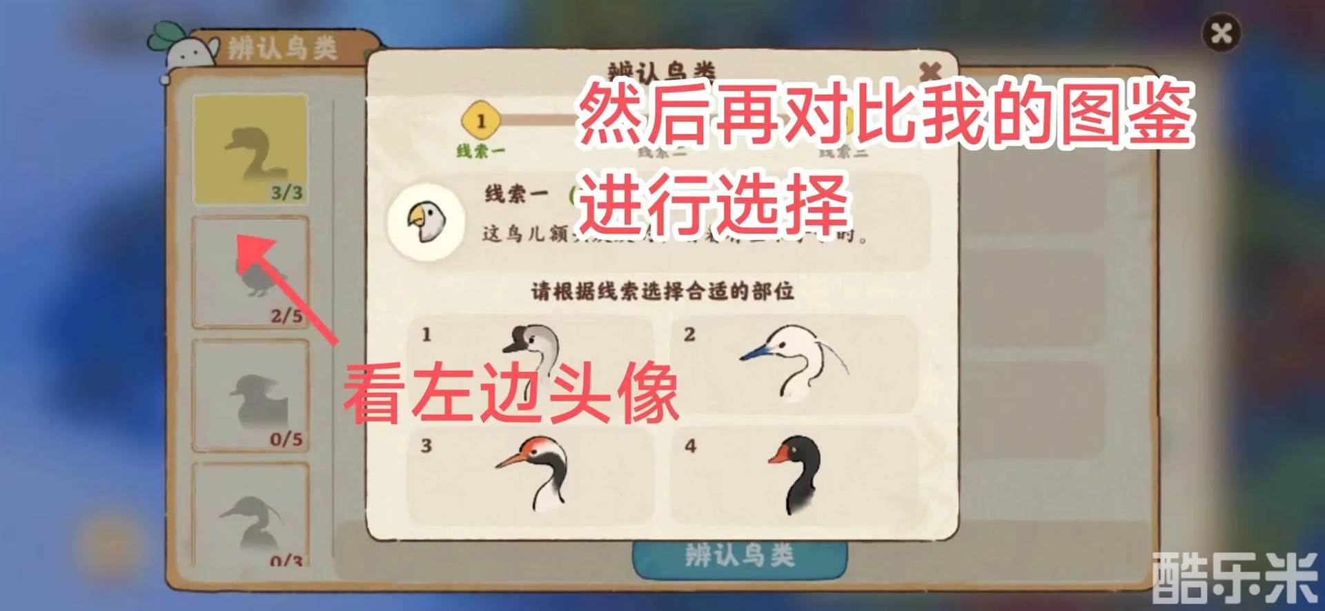 辨别鸟类线索时,注意左边的小头像,对比我的头像,然后查看。
