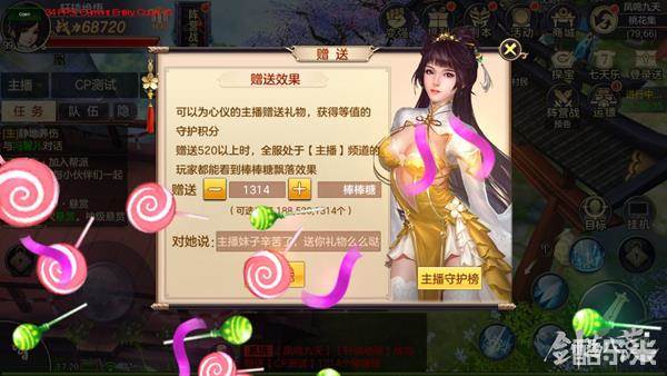 如果玩家觉得当前直播的主播表现优秀值得赞赏,或遇到欣赏的主播,玩家可以在“主播”聊天频道为主播送上“棒棒糖”作为礼物,为主播打call,不同档次的礼物对应不同的赠送效果及守护积分,快来请你心爱的主播吃棒棒糖吧!当赠送520以上个棒棒糖时,全服处于【主播】频道的玩家都能看到棒棒糖飘落的效果。守护积分在前列的玩家更可登上主播守护榜哦。让你醉卧美人膝,醒掌天下权!