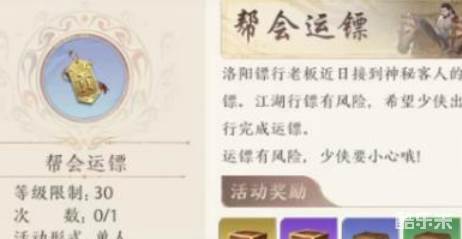 这个玩法只存在与帮会之中,全名叫做帮会运镖,所以大家在游戏中想要体验的话,首先要加入帮会,加入帮会之后,每天晚上的7点到9点大家就可以参与其中,这个活动是不需要大家组队的,单人参与就可以啦,点击进入活动。
