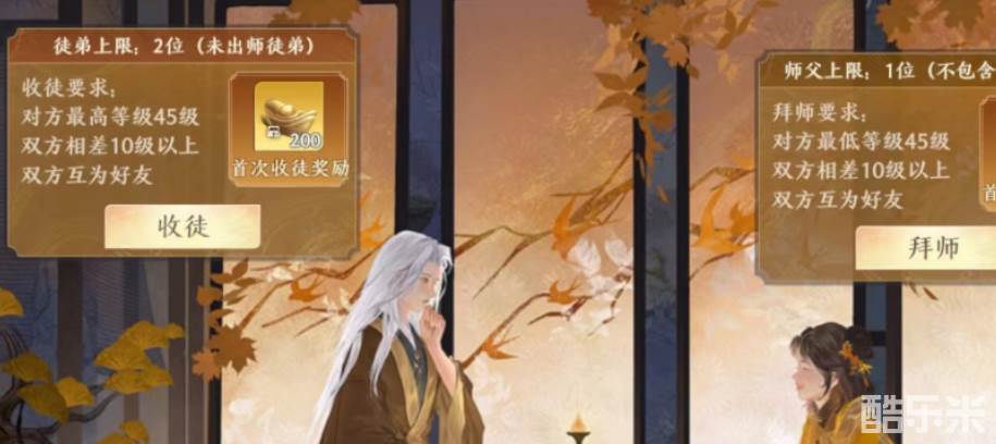 不过大家在拜师的时候是一定要小自己师傅30级的,大家的条件满足,对方也接受的拜师申请的话,之后师徒二人就可以一起组队参与副本,到了大家的师徒数值满了之后就可以出师哦,出师之后要是大家到了45级的话,就可以自己当师傅收徒弟啦。