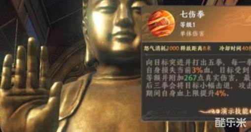 七伤拳是一个橙色招式,这也是一个近战招式,使用之后会掉少量生命值,造成等量伤害,一共有七拳,后面的几拳可以造成击退的效果哦;第二个是擒龙功,这个招式是一个绝对控制的招式,放在开团的时候是最好用的,而且成功拉人过来之后还有定身的效果哦。