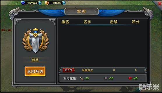 开启军衔系统后,通过杀死敌对玩家、阵营活动、战场,获得阵营积分,累计达到相应军衔的积分线即可获得该军衔,初始最低为新兵,不同军衔所获得的属性增益也不同