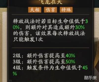 另外他还有两个天相,它们两个的效果分别是在角色的血量低于十分之三的时候,就会产生额外的伤害,这个每次使用大招的时候就只会触发一次。另一个的效果是在攻击到敌人之后,便能回复五分之一的血量并提升防御力。