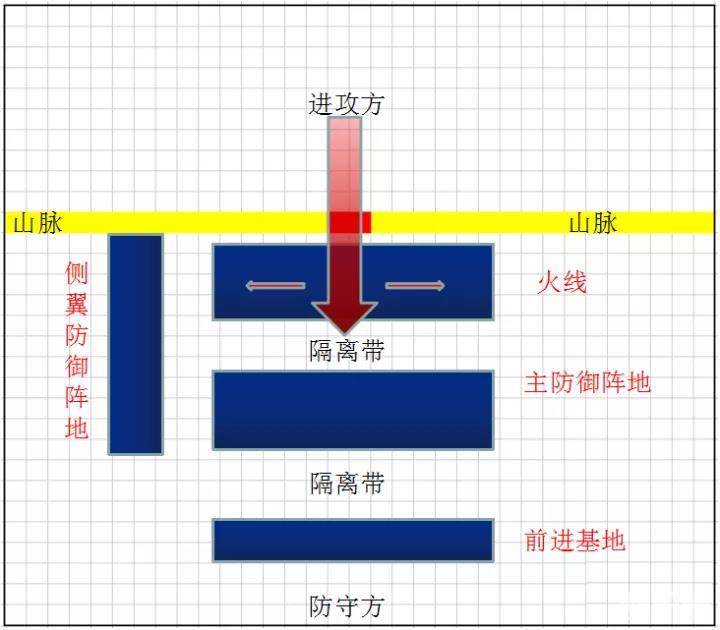 2、进攻方指挥官的注意力主要放在正前方的要塞上,力争短时间内突破。一旦突破了一条防御线,进攻方会认为阶段性目标已经达成;