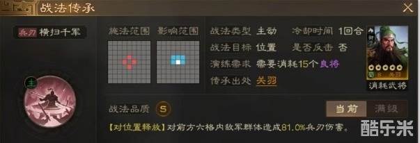 横扫千军由关羽传承后获得,从传承者自身品质就能看出该战法非同一般,使用之后伤害范围为以自身为中心,前方六格以内凡是里面敌军都能受到高额兵刃伤害。笼罩范围大而且伤害比例高,是现在兵刃输出武将首选,例如赵云,孙策,吕布,关羽以及差些的黄盖、徐晃等。纷纷将其作为自身毕业搭配。