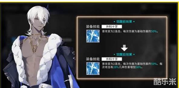 例如:①渡觉醒2阶段时,装备技能【外科十字】追加效果:每次攻击有20%几率伤害增加50%
