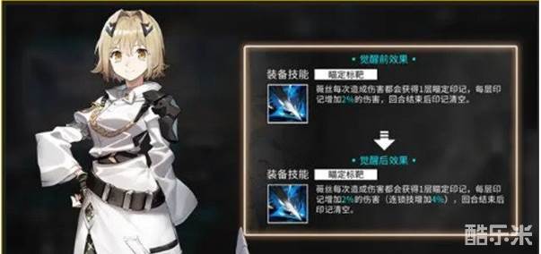 ②薇丝觉醒3阶段时,装备技能【瞄定标靶】追加效果:每层瞄定印记为连锁技增加4%的伤害。(装备等级10级时效果)
