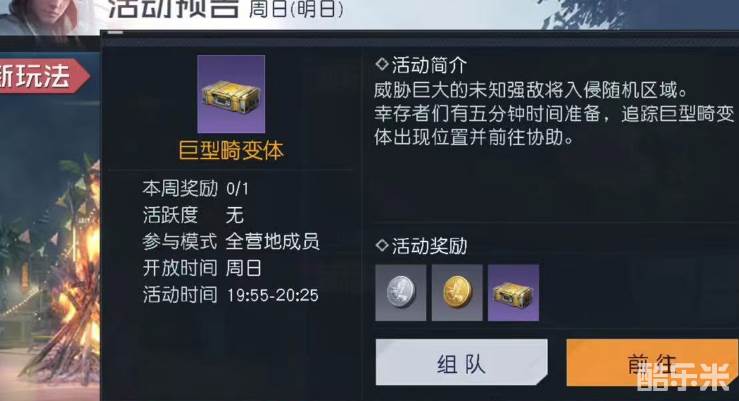 巨型畸变体属于营地成员的活动,换言之就是说玩家小伙伴需要加入到营地中才可以参与此类活动,如果小伙伴们还没有加入营地又想要参加活动的话,还是需要尽快找一个营地加入即可。开放的时间是每周日,但并不是周日全天,活动开放的时间是19点55分至20点25分,共计半个小时的时间段内,所以玩家小伙伴们要注意时间啦,只有短暂的半个小时时间可以体验,错过需要再耐心等待一周,想要体验的小伙伴可要抓紧好时间安排。并且活动可以组队也可以单人,找不到伙伴的话独立参与也是没有太大影响的。