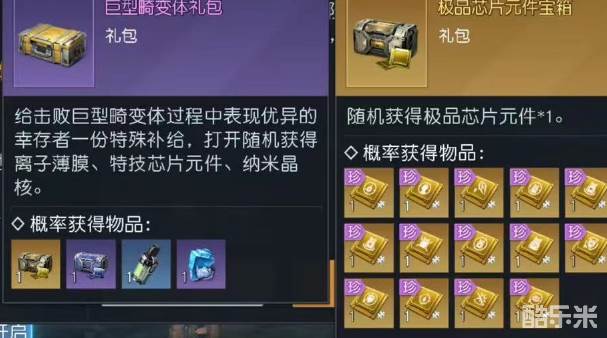 活动完成后也会获得相应的奖励,当然奖品也是十分诱人的。首先金币和银币自然不会落下,活动还会特殊赠与一个巨型畸变体的礼包,礼包的话内置四件产品,不过是随机获得的,小伙伴可能获得极品芯片元件宝箱、稀有芯片元件宝箱、离子薄膜和纳米晶核其中的一个。极品芯片元件宝箱和稀有芯片元件宝箱也都是会随机获得属性奖励,开宝箱这里就属于看个人运气如何了,小编希望各位小伙伴都能好运常在,可以开出自己想要的宝物。