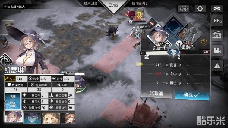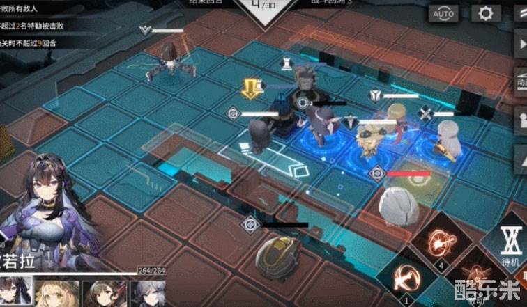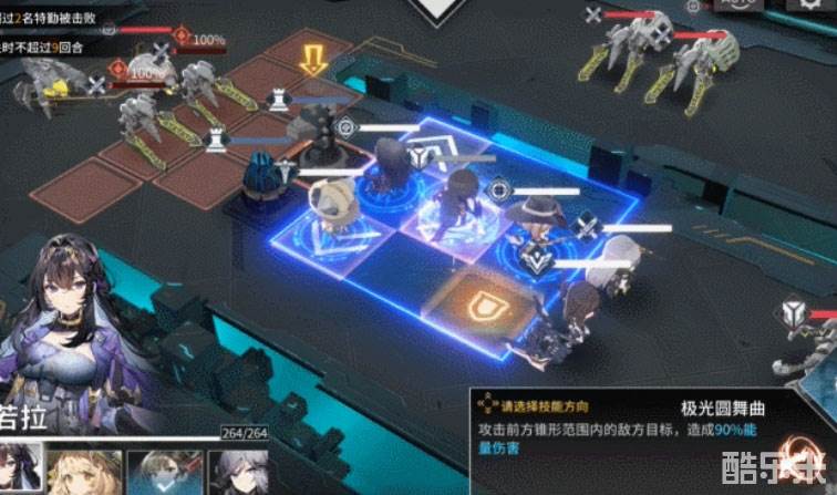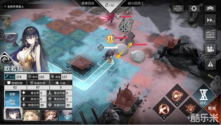 但是这里也有一个需要随机应变的地方。欧若拉的被动需要和队友形成夹击后才能提升攻击,那么欧若拉一般就是要等队友到达位置之后再移动才能在当前的回合中,吃到30%的加成。所以移动前进单位之前,要先看看欧若拉能不能形成夹击,不能形成就别太靠前。