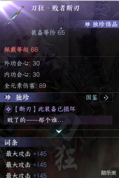刀狂武艺精湛,一生战胜过挑战者无数。此番击败或者抚平刀狂后,或将掉落独珍装备【刀狂·败者断刃】,可提供巨额最大攻击加成——源自其中一位无名的战败者。