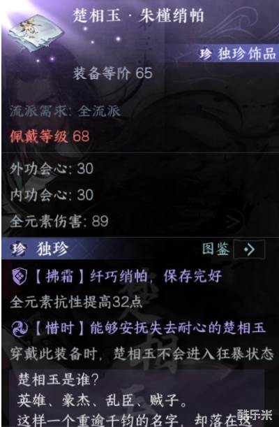 击败楚相玉,或将掉落其珍藏的独珍装备【楚相玉·朱槿绡帕】,提升全元素抗性,同时再遇楚相玉时,他将因这件独珍饰品而平静下来,不会陷入狂暴。看来盖世如楚相玉,年轻时也有一段红尘往事呀……
