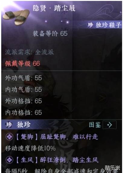 与隐贤“交流”完毕后,或将掉落独珍装备【隐贤·踏尘屐】,每隔5秒解除全部定身、减速效果。当然了,由于这鞋子穿起来实在是难受,移动速度会降低10%。