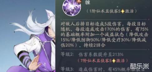 目前游戏中对该角色设计了两种不同形象,分别是人形态和半妖形态,属性也有较大区别,首先来介绍下雷属性状态的该角色。擅长攻击敌方后排,能够对所有目标造成多段伤害,每段伤害选择目标完全随机确定,在输出时候还有几率附加一个不良状态。在降低攻击,降低防御,降低受疗效果和减伤等四大类型中任选,施加之后将持续两个回合,后续等级提升之后,还会附加驱散增益额外效果。
