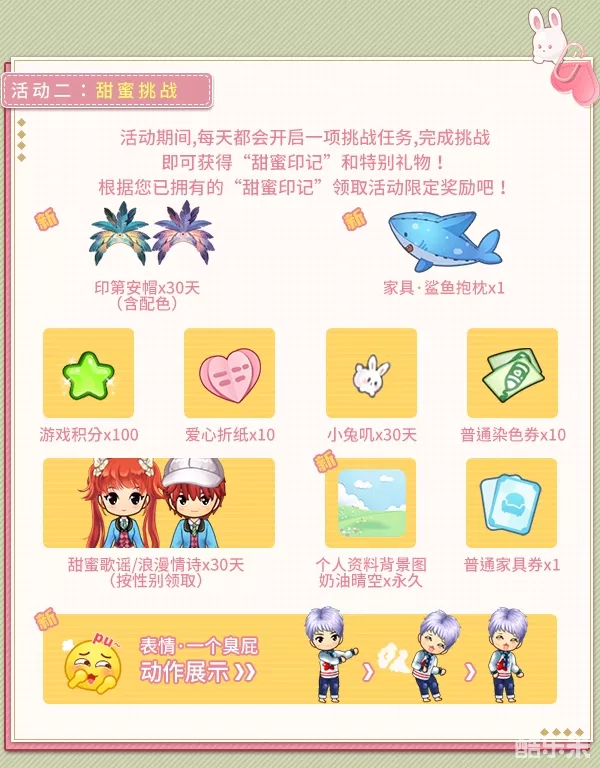 活动期间,每天都会开启一项挑战任务,完成挑战,即可获得“甜蜜印记”和特别礼物!根据您已拥有的“甜蜜印记”,领取活动限定奖励吧!