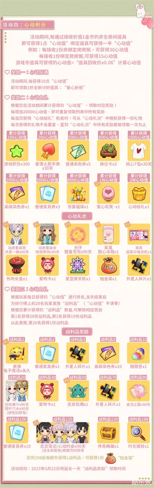 奖励三:根据玩家每日获得的“心动值”进行排名,当天结束后,为排行榜上前20名玩家发放“战利品”(“心动值”不清零),根据您累计获得的“战利品”数量,可解锁相应奖励!