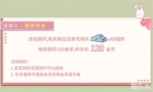 活动期间,每天每位玩家可购买49份银砖,每份原价150金币,秒杀价120金币!