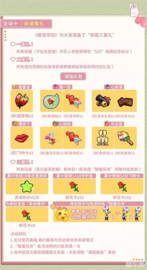 三重礼:所有玩家(无论是否新婚)和伴侣一起完成“甜蜜任务”,领取对应奖励!