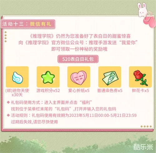 活动规则:礼包码使用有效期为2023年5月11日00:00-5月21日23:59,过期后失效,请您尽快使用。