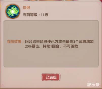 伶俐:回合结束阶段使我方攻击最高3个武将增加20%的暴击,持续一回合,不可驱散。