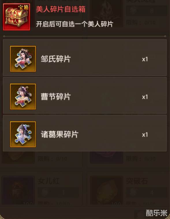 在不定期开启的运营活动中,也可以抽取到美人碎片自选箱子,自行选择需要获取的美人碎片合成即可。(小提示:已经获取到的美人就不需要再自选啦。)