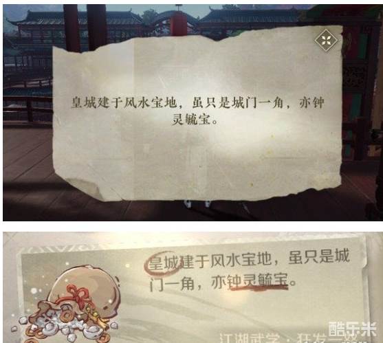 2、纸条上写着有关皇城城门一角的内容,暗示玩家宝箱就在城门附近。