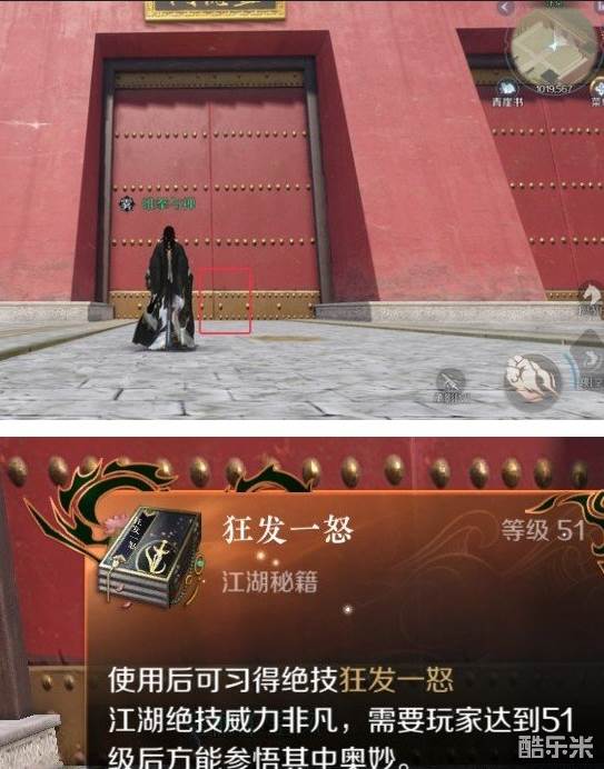 4、依据红光指示前进,可以在皇城门后看见一个巨大的宝箱,开启箱子就能找到“狂发一怒”技能了。