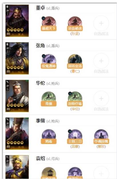 这里放一个比较顶配的叠毒配队。核心思路还是保证李儒打伤害,为此需要一个坚实的前排和一个大奶,因此张角带固若金汤这样援护或者其他控制的技能都行,李儒猥琐士别,抓机会上毒和吸属性,三回合后迎来爆发,华佗大奶。另外的位置偏功能性,可以补董卓前排,袁绍功能性,也可以文丑补单点输出。