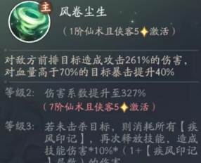 主动技能风卷尘生,伤害敌方前排所有单位,并且对血量较高目标额外提升暴击率,在等级提升之后,如果技能使用出来没有击杀目标,则将身上所有疾风印记全部消耗掉,再次释放一次技能。印记数量越多,追加技能伤害也就越高,如果成功击杀目标自身血量得到大幅恢复,立即获得三层疾风印记。