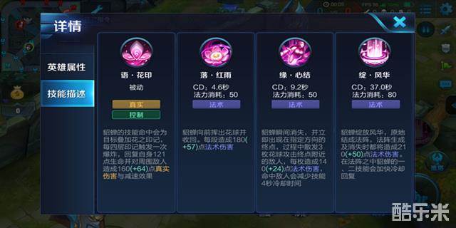 貂蝉向前位移一段距离,到指定地点后对周围敌人发散三枚花球(每枚花球叠一层印记)对其造成伤害,三枚花球同时命中一名敌人时减少二技能4秒冷却时间。值得注意的是貂蝉位移过程中能将敌人伤害无效化,不论是躲避技能规避伤害或是追击敌人都十分有用。