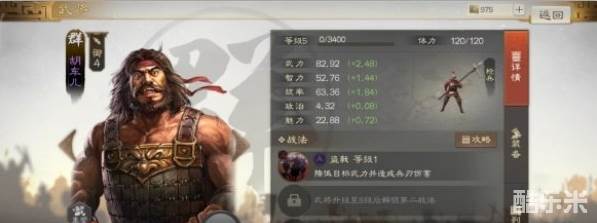 1、在游戏中,胡车儿是属于群雄势力的一名紫将,可能有人觉得这样一个名不见经传的小将不堪大用,而从这名武将的五维面板来看似乎也确实如此:除了武力值还算凑合之外,其他几项属性都平平无奇,而他的特性更是只有提升武力和统率两项加成,看上去就是一个没啥用的大众脸将领。