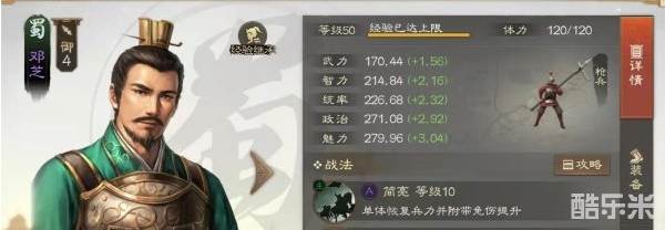 在五项属性上,邓芝除了武力偏低以外,其他四项都是有超过2的成长数值的,其中最高的还要当属魅力,这点倒是与其历史上的社交达人形象非常符合,可惜其魅力的基础数值不算太高,否则甚至是可以破三百的。另外他的统率和政治也达到了中上游水准,因此在战斗中抵御一波攻击,和在主城担任一些官职都是绰绰有余的。