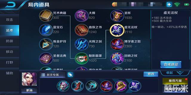 虚无法杖提供了可观的法术攻击以及生命值加成。被动的百分比穿透效果,主要用于应对敌方法术防御装备成型以削减敌方防御能力,提升自己的伤害。