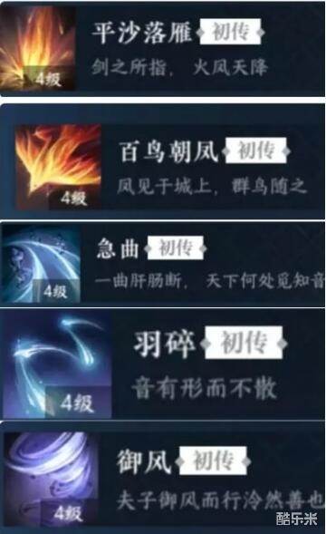 选择→平沙落雁+百鸟朝凤+高山流水+羽碎+凌波微步