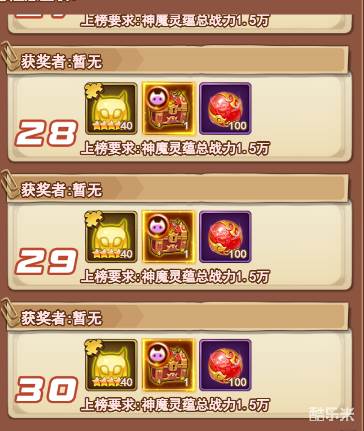11~15上榜最低要求神魔灵蕴总战力需要超2.5W,所赠送的道具会根据排名不同进行发放,保底可以获取一个鬼魅妖丹*1,除此之外还可以获取一定数量的熊猫碎片和神魔突破石4~10上榜除满足战力要求外,还要满足当然充值超过12元。所获取的奖励根据排名的不同将获取不同数量的悟空碎片和万应灵丹。